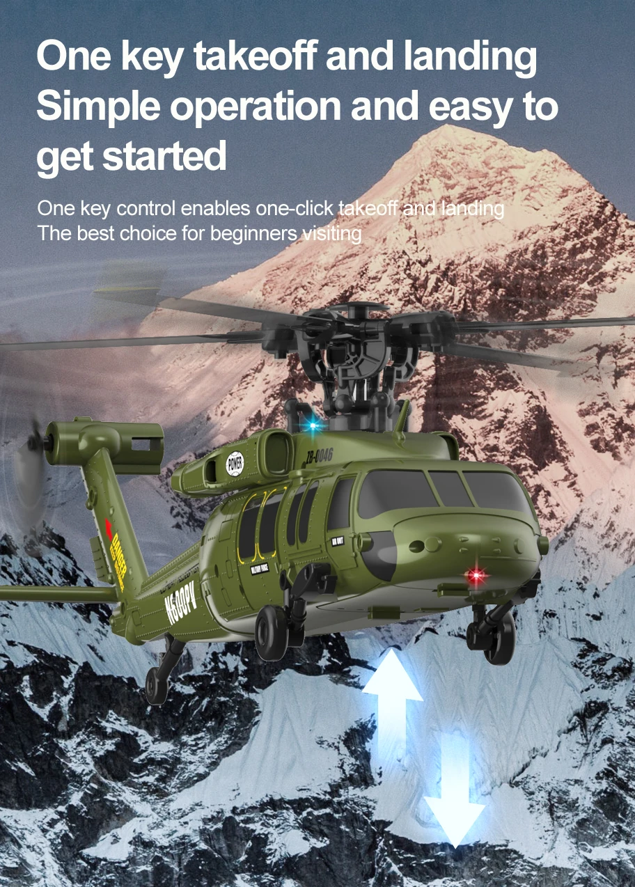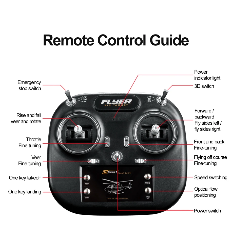 Trykk på en knapp for automatisk take off. Helikopteret tar da automatisk av og blir stående stille i luften i passende høyde. Det rører ikke på seg før man begynner å bevege stikkene. Ønsker man å avbryte flyvningen, så trykker man på den automatiske landingsknappen og det lander trygt av seg selv. Enklere blir det ikke.