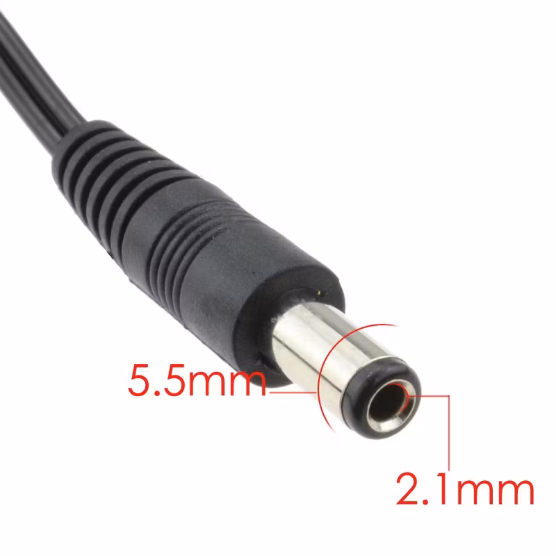DC plug: 5.5 mm ytre, 2,1 mm indre diam