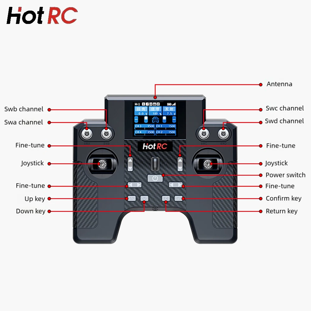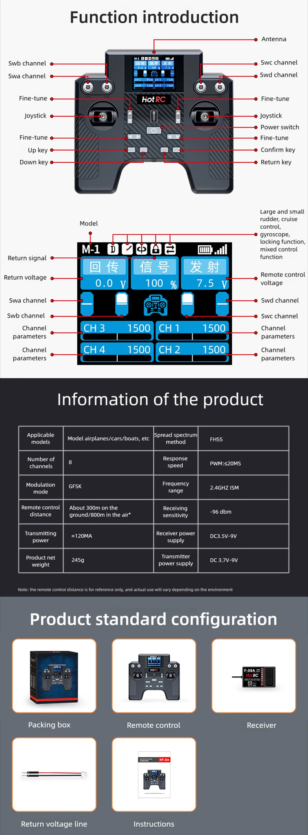 1. 1.7-inch color screen 8-way remote control receiver with standard return function