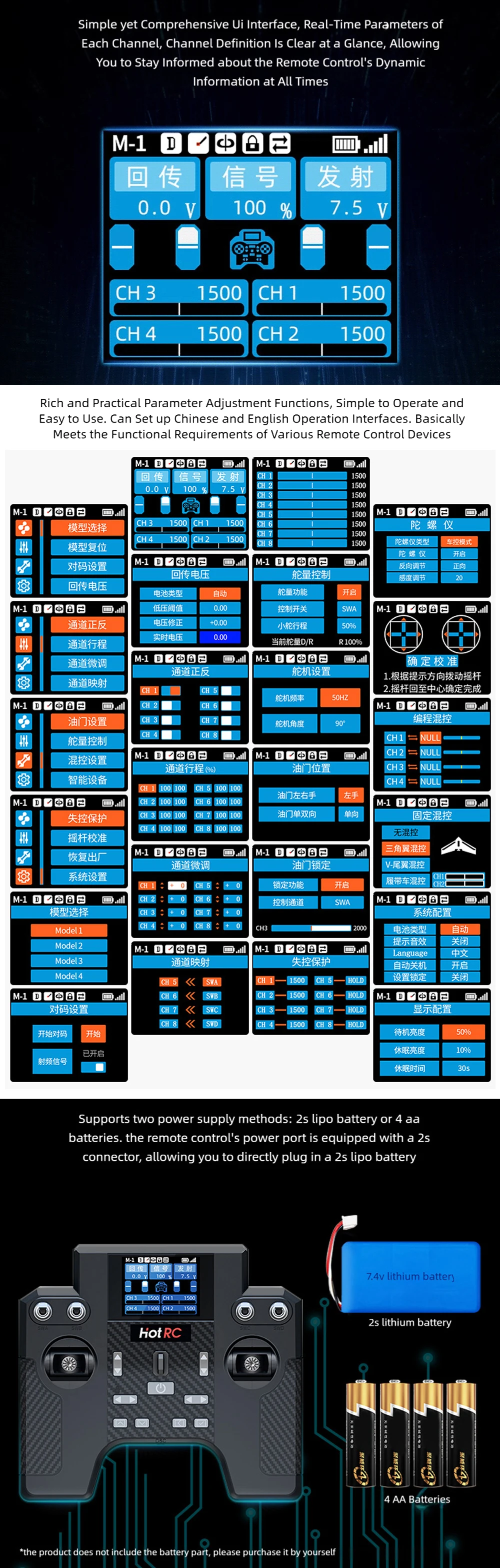 Tiden er forbi at det koster skjorta for en god radio. Denne radioen overrasker de fleste. Hall-gimbals, som man bare finner på langt dyrere radioer, med ekstremt presise stikkebevegelser. Meget bra, rimelig og godt moderne anatomisk utformet fullsize radio i carbongrip kabinett. Solid og godt konstruert med forlengbare stikker for enda presisere betjening. Stikkene er også lett avtagbare for sikker transport. Ligger godt i hånden og er enkel å betjene. Kontrollene er av meget høy kvalitet som gjør at servoene beveger seg presist og følger stikkebevegelsene 100%. Ingen flutter eller rykkvise bevegelser som normalt finnes på rimelige radioer. Servoene gir fra seg mye mindre lyd og beveger seg mykere enn på alle tilsvarende radioer vi har prøvd. Billige sevoer høres ut og oppfører som servoer som koster det mangedobbelte. Det følger med en 8 kanals mottaker med telemetri. Bruker man S-bus mottaker og Byme-A gyro, så har man et oppsett med en avansert gyro, som kan slås av og på i luften også. Se bilde av dette. Radioen er også utstyrt med dual rate funksjon (små eller store rorutslag), V-tail- og elevon mixing. Den har også justerbar Fail Safe Funksjon og automatisk avstengning av senderen hvis den har vært uvirksom i mer enn 15 minutter. Dette for å ikke tappe ut batteriet hvis man glemmer å slå den av. Den er i tillegg utstyrt med fire lett tilgjengelige servoreverseringsbrytere i fronten. Disse, sammen med mode- og trimbryterne kan låses for å unngå uheldig bruk i luften. Radioen er dermed meget enkel å bruke og krever ingen programmering i utgangspunktet. Den kan tas i bruk rett fra esken. Alt man normalt trenger, både på små og store modeller, er oversiktlig plassert i fronten og på displayet. Egne brytere for f eks flaps, gyro, retract, kamera osv. Radioen passer til alt fra små enkle nybegynnermodeller til store motormodeller og glidere. Senderen har også trainerutgang og mulighet for bruk av oppladbart Lithium senderbatteri. For korrekt oppstart og bruk se norsk brukermanual.