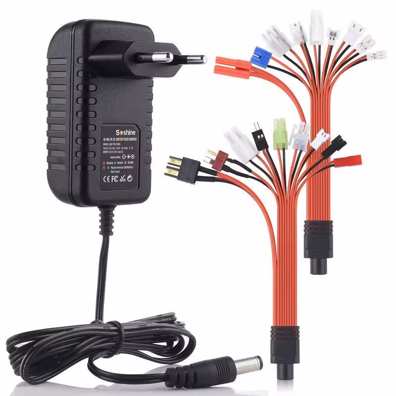 Lader for 2-10 cells (2,4 - 12 volt) NiMh og NiCAD samt blybatterier, komplett med en rekke overganger som passer flere typer batteriplugger. Se bildene. Noen av bildene viser flatstikkere på 220 volt tilkoblingen, men laderen kommer med runde EU stikkere som passer i en vanlig norsk 220 volt strømkontakt. Laderen kutter automatisk når batteriet er fulladet.
