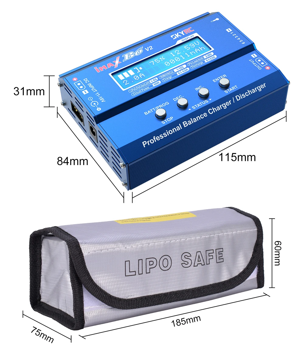 SkyRC B6 V2 is a DC input high-performance, micro-processor controlled charge/discharge/DC/DC converter with battery management suitable for all mainstream battery types(LiPo / LiFe / Li-Ion / LiHV / NiMH / NiCd / Pb). The charger delivers dedicated 60W integrated power and charge current can up to 6A . Additionally, it supports DJI Mavic/Inspire Battery with maximum 4A charge power.