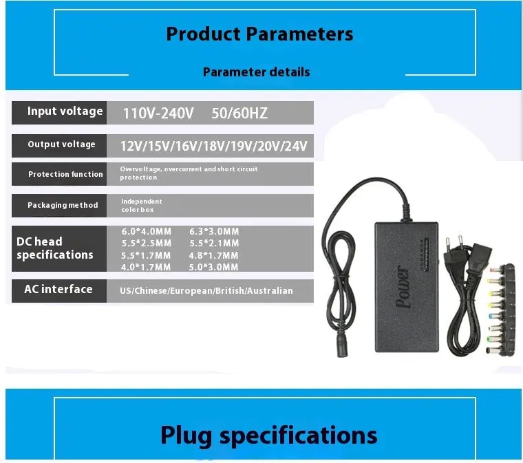 Output terminal: Eight interface options: 6.0mm * 4.0mm (with needle) 6.3mm * 3.0mm 5.5mm * 2.5mm 5.5mm * 2.1mm 5.5mm * 1.7mm 4.8mm * 1.7mm 4.0mm * 1.7mm 3.5mm * 1,35 mm 35mm