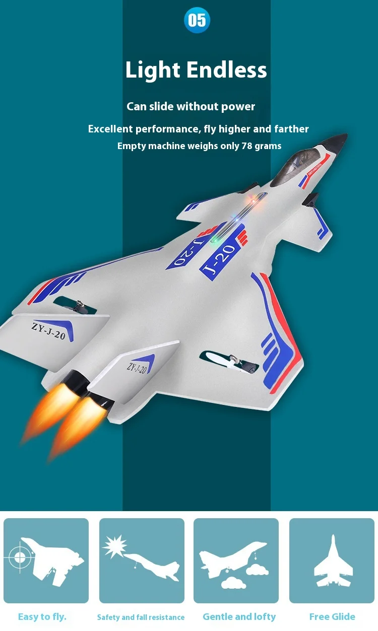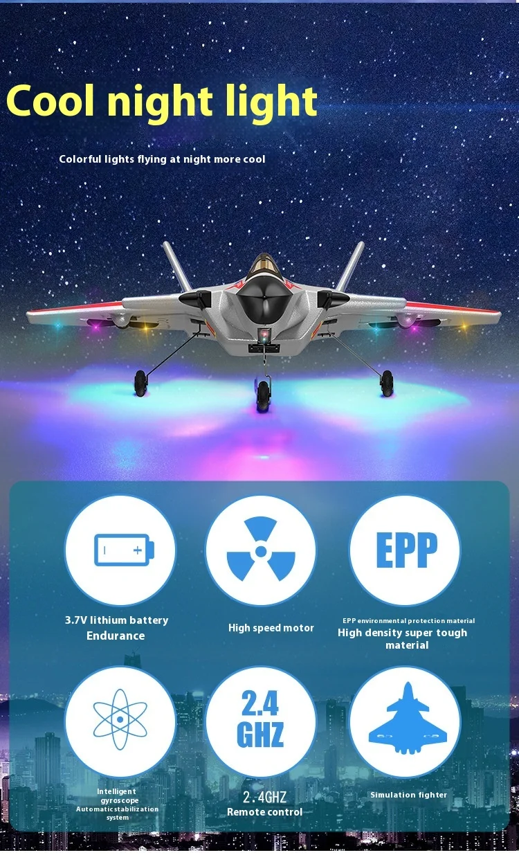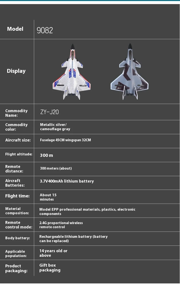•2.4G 3CH EPP Foam Remote Control Fighter Fixed Wingspan Glider :This RC plane is designed with a fixed wingspan, making it easy to control and maneuver. The 2.4G 3CH EPP foam material ensures durability and longevity.